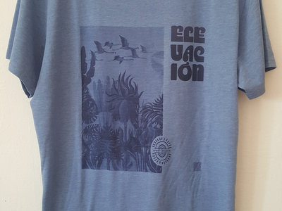 Blue t-shirt 60% polyester 40% cotton with blue colour printing, Elevación album artwork on the front and Afroterraneo logo on the back.